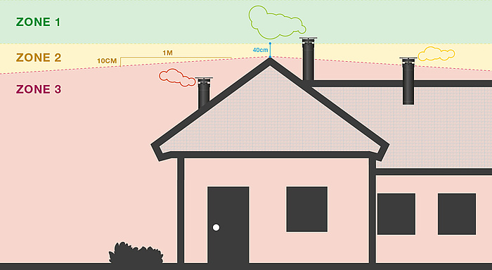 In zone 2 you can experience bad chimney draft in periods. The draft will be particularly affected by the wind direction, while big trees and other buildings nearby the chimney can also have an effect on the draft. If you experience difficulties in zone 2, it can be remedied by extending the chimney so it is placed in zone 1, or you can mount an Aduro DraftOptimizer.